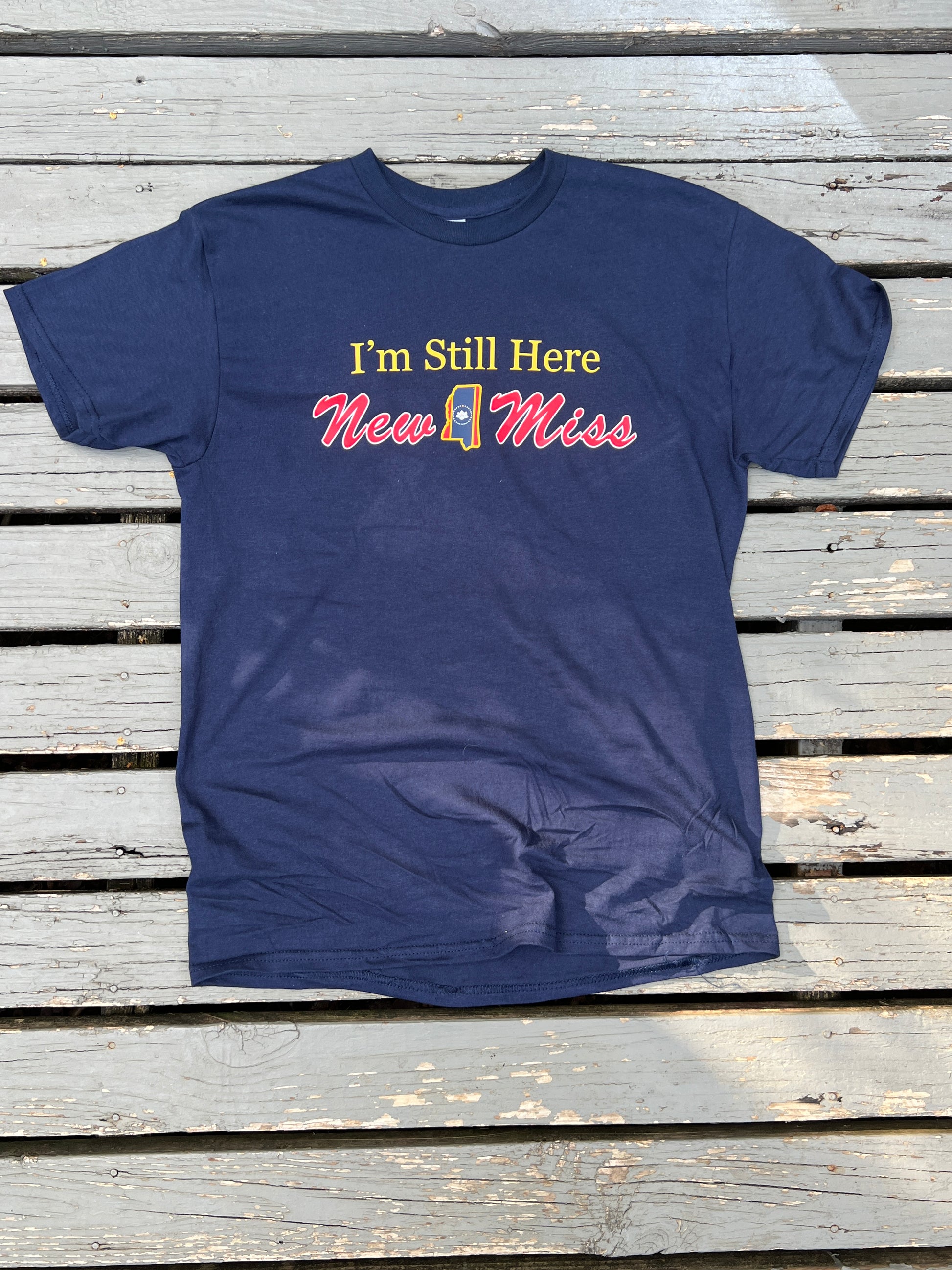 Limited Edition short sleeve Navy T-shirt featuring " I'm Still Here" with New Miss and State cutout.